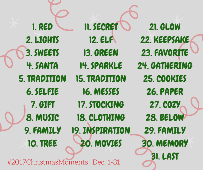 I’m joining several of my Instagram friends for a fun photo challenge during December – and you can join, too! Each day in December is assigned a prompt that will help you to find the beauty in those little moments. Snap a picture and share it on social media (Facebook works if you don’t do Instagram) and use the hashtag #2017ChristmasMoments so everyone can see your photos.