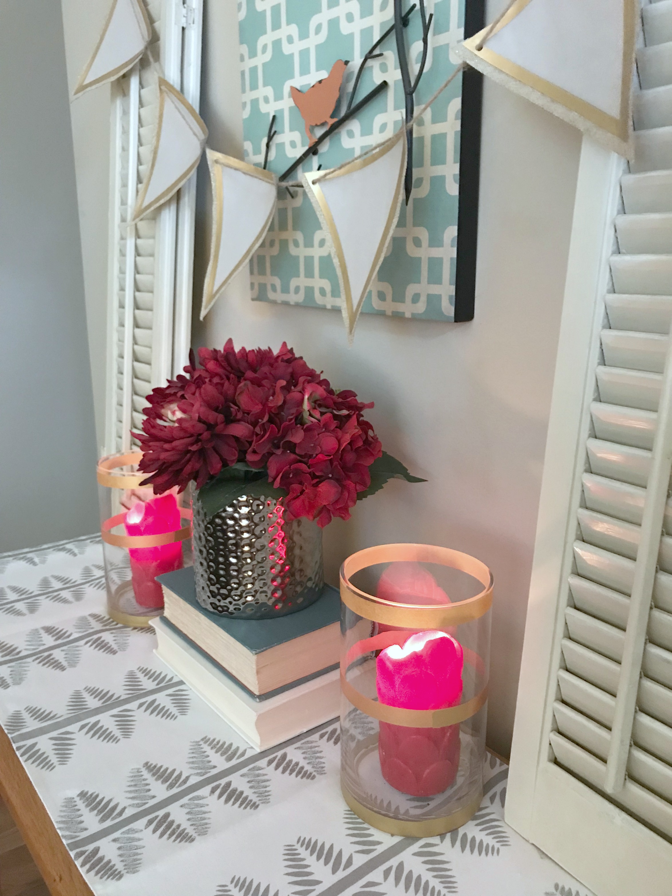These red candles look pink when they’re burning…and I really think white pillar candles would look better, but I’m using what I have!