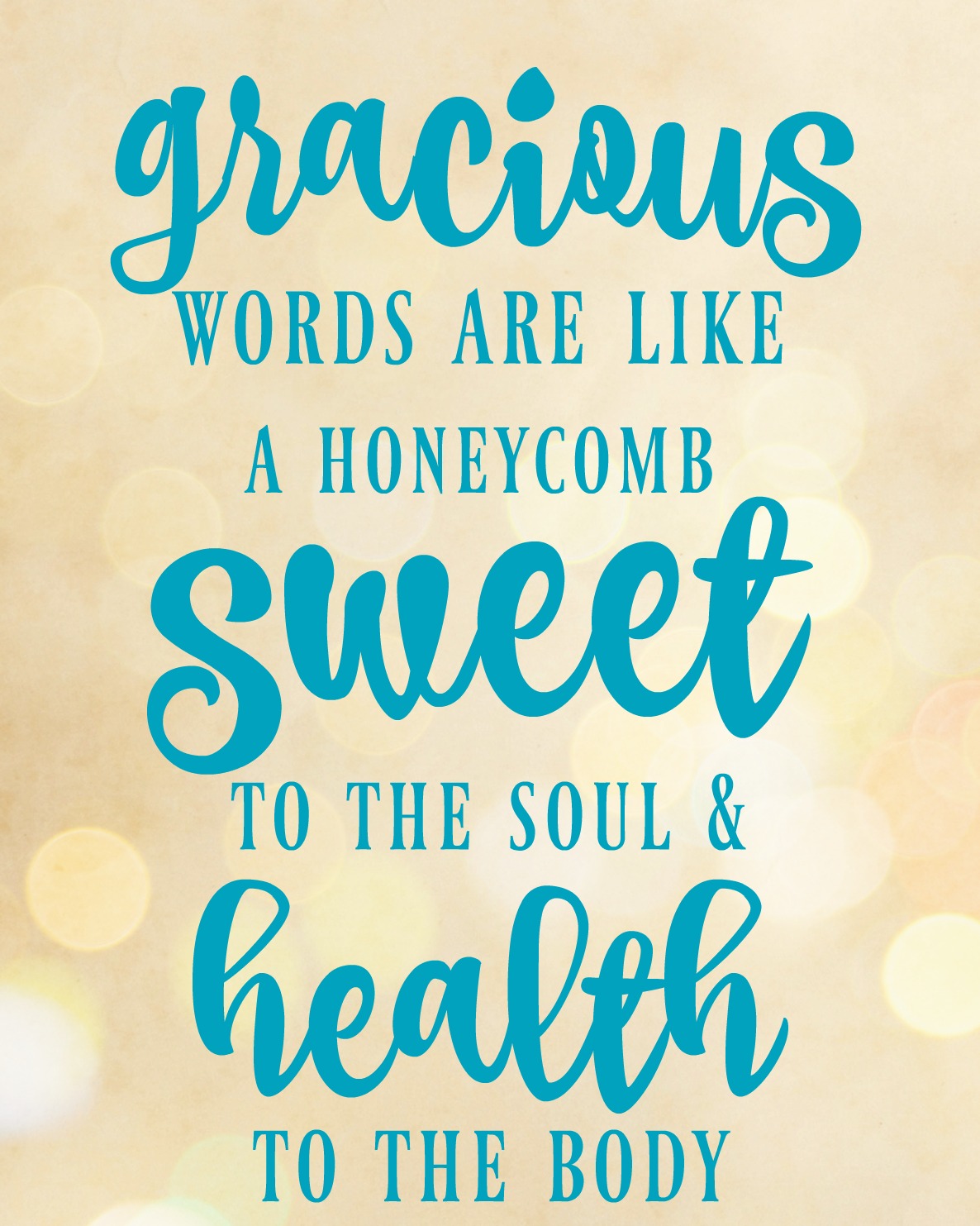 I’m asking the Lord to help my words to be all those things – gracious, sweet and healthy! I can’t say that it’s transformed me into a person who only says gracious, sweet and healthy words…but I can see growth in my life as a result. Gracious words are not just beneficial for the hearer – they benefit the speaker as well.