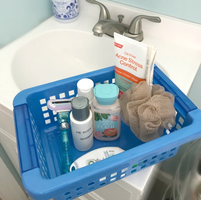 #5 I used a makeshift shower caddy to corral my travel shower items. It’s always tricky to line up all your little travel bottles of shampoo, conditioner and body wash on the tub without them falling all over the place (which also grosses me out…), so I packed a small bin from Dollar Tree.