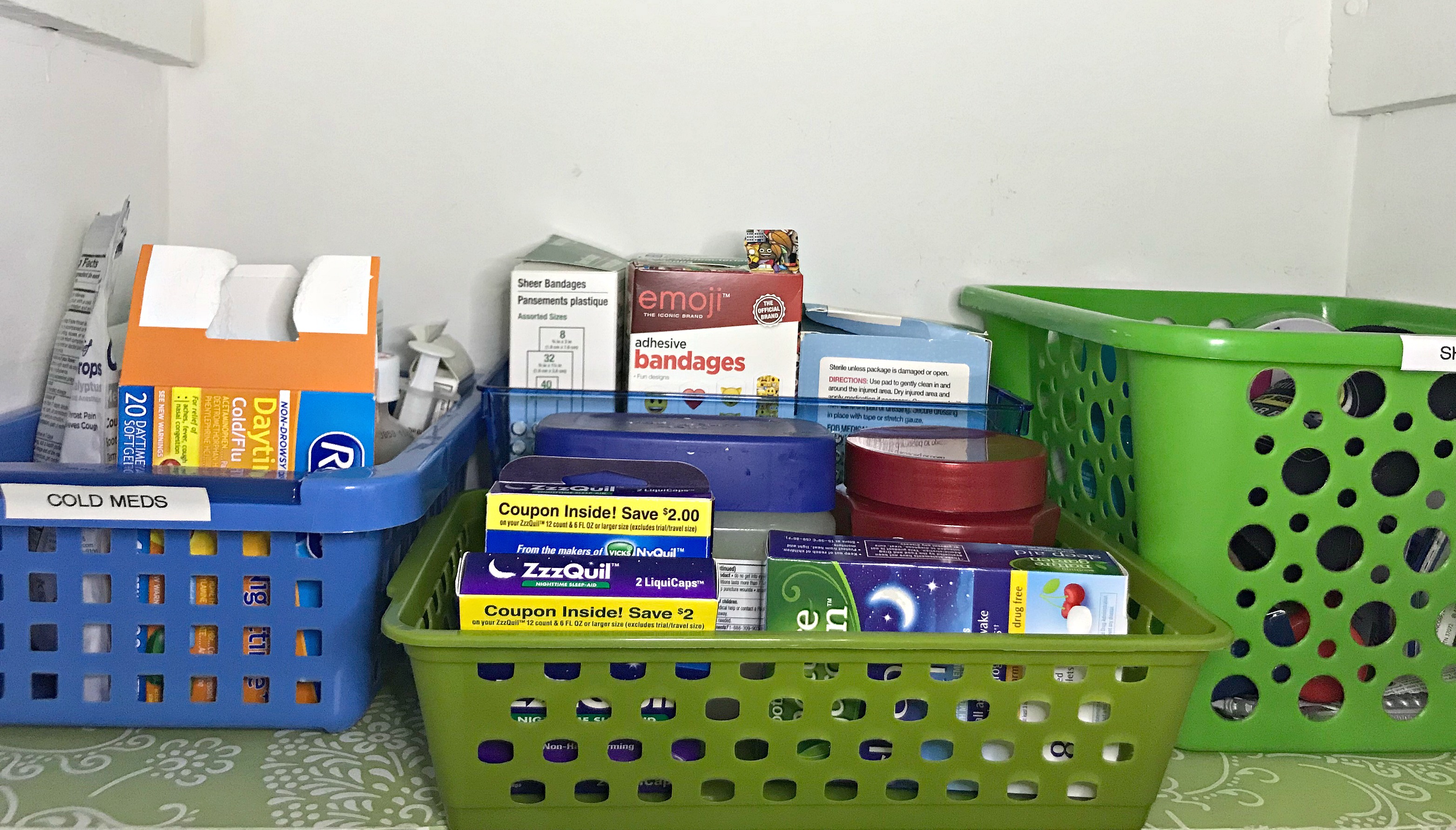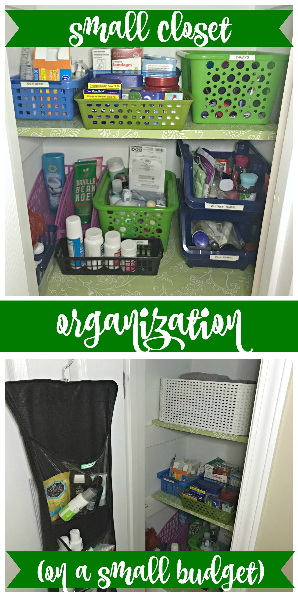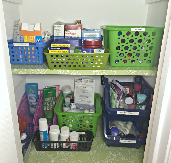 I started my quest to have an organized home at least year before I began blogging. One of the first organization projects I tackled was the tiny closet over our air return. Since neither of our bathrooms have a closet, this space is the designated first aid/travel toiletries/overflow bath and body product closet!