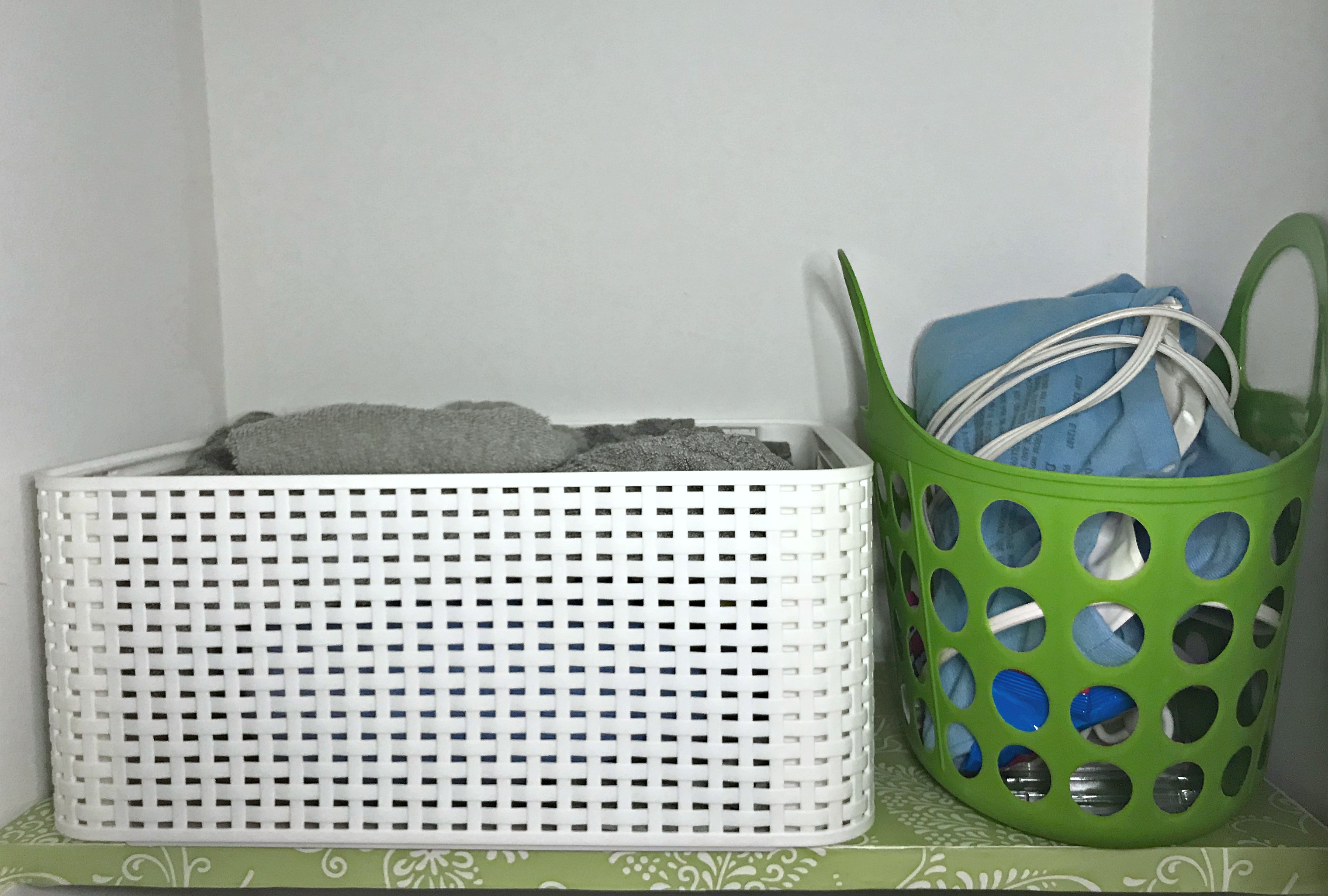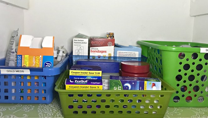 When I realized I needed a few different bins in place of the ones I had previously, I reached for the ones in my stash. At first I hesitated to use them because they don’t match the green ones I’ve been using…but I remembered this post from my friend Laura at Organizing Junkie and decided that they didn’t have to match – they just have to be functional!