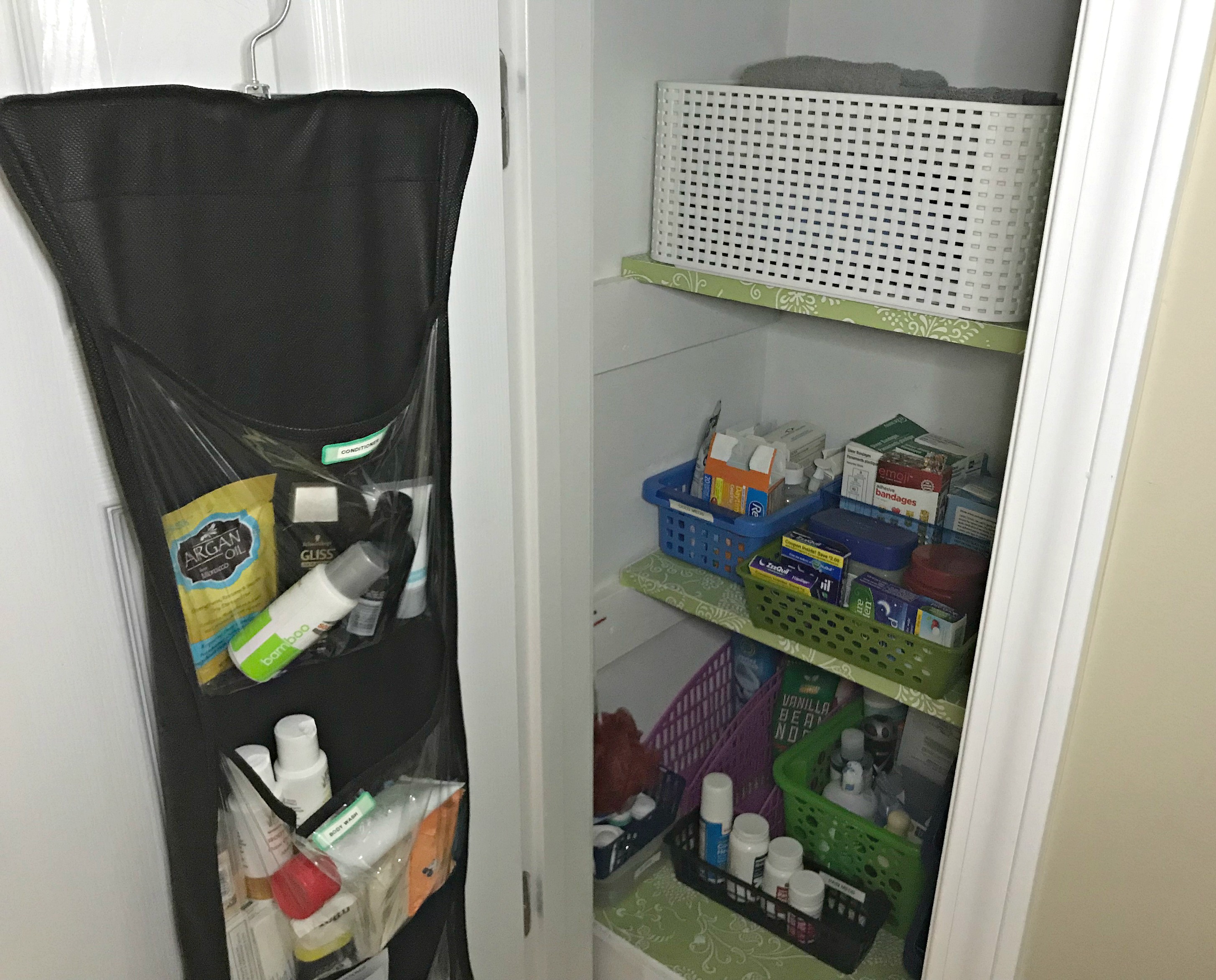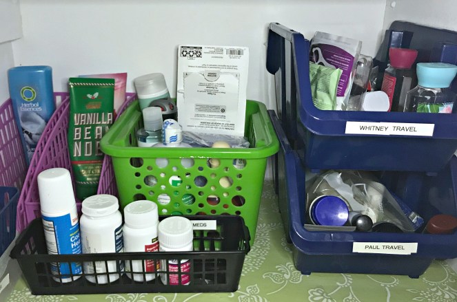 It’s very hard to get pictures in the hallway, but here’s a look at the three pocket organizer that holds our travel sized items. This is a great way to maximize space!