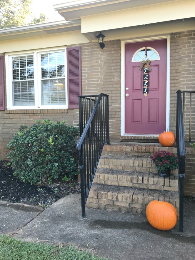 I do try to keep the outside of my house fairly seasonally appropriate, so here’s a look at my simple outdoor decor for this fall. With pumpkins for $2.50 and mums for $4 at Aldi, I spent under $10 putting it all together! Since taking these pictures my mum has doubled in size with all the blooms. I really love the burgundy color against our house!