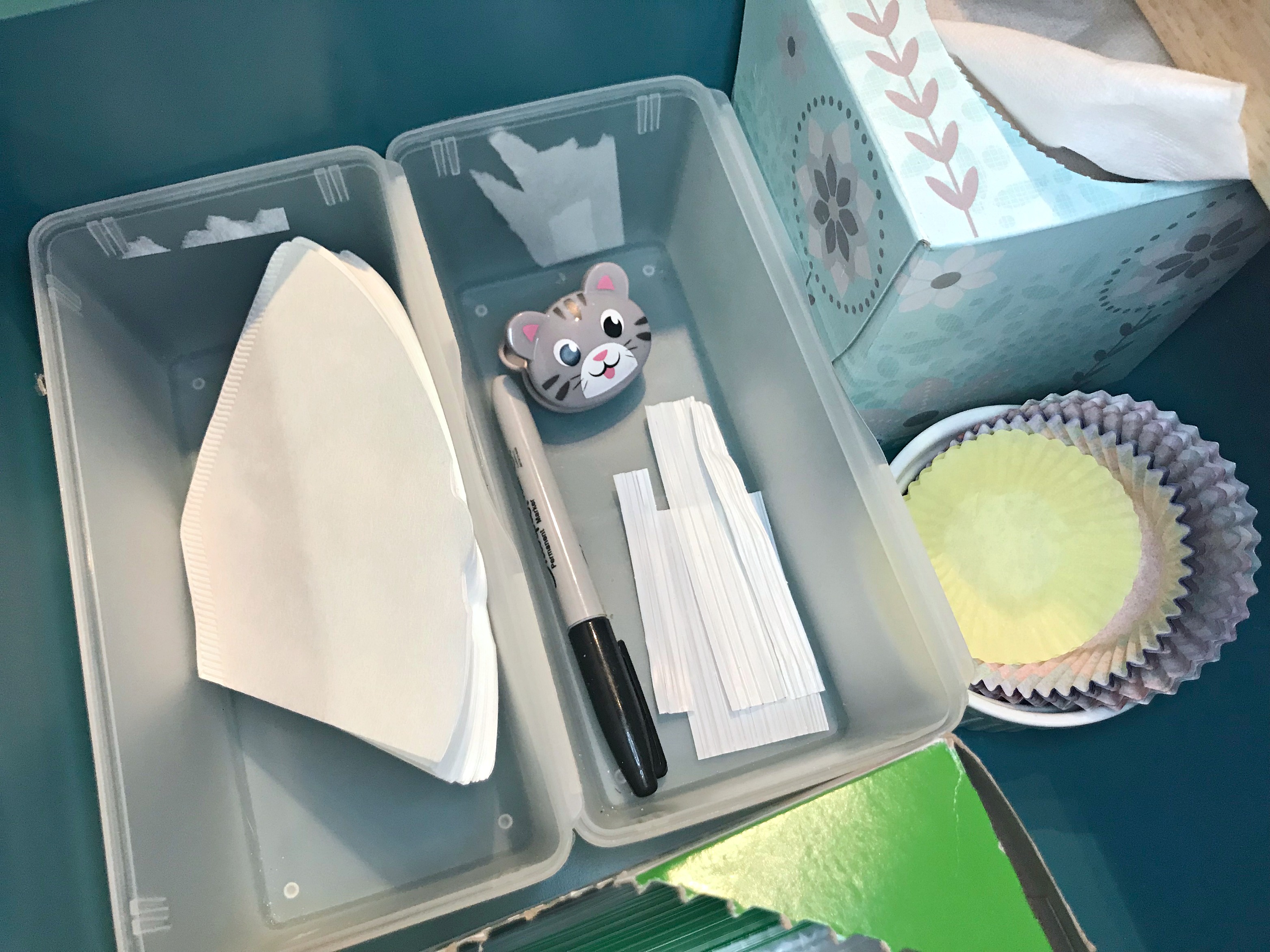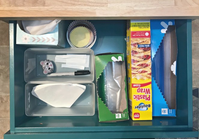 This is what it looks like from overhead – it’s uncluttered so I can easily see what I need. I have plastic wrap, foil, freezer & sandwich bags, coffee filters, extra chip clips and twist ties, a marker for writing on the freezer bags and a box of tissues. Those are things I reach for at least once a day (most days).