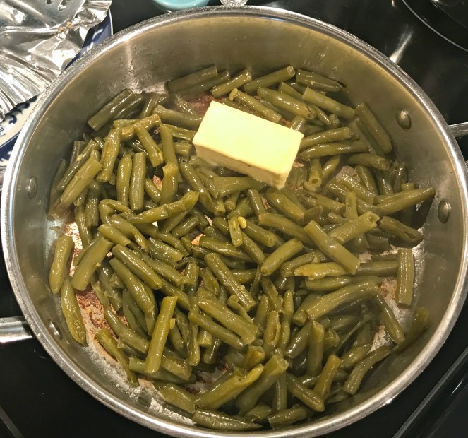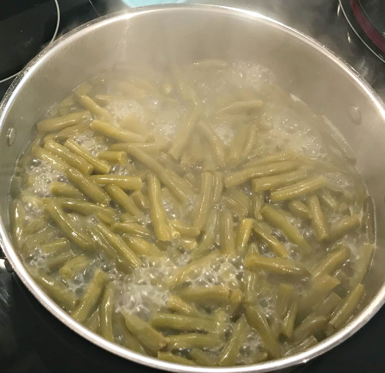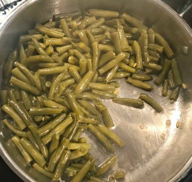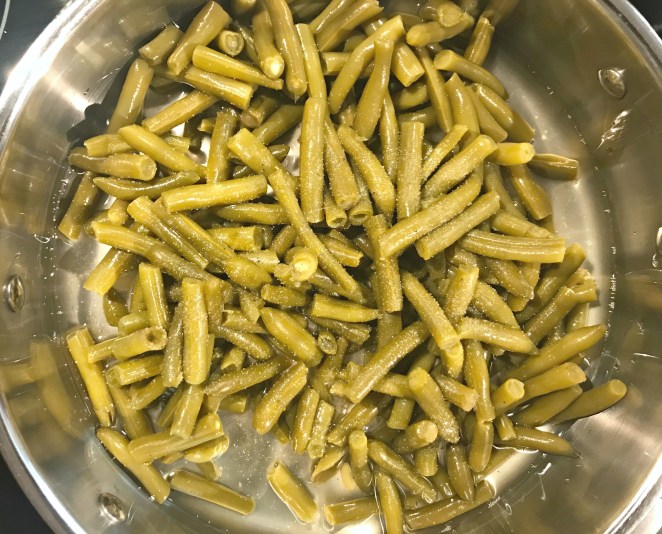 Place a large, flat skillet (a pot or sauce pan will not work) on medium-high heat. Add your canned green beans and at least half the juice from each can. I usually make two cans of beans, so I add all the juice with one can and then drain the other one.