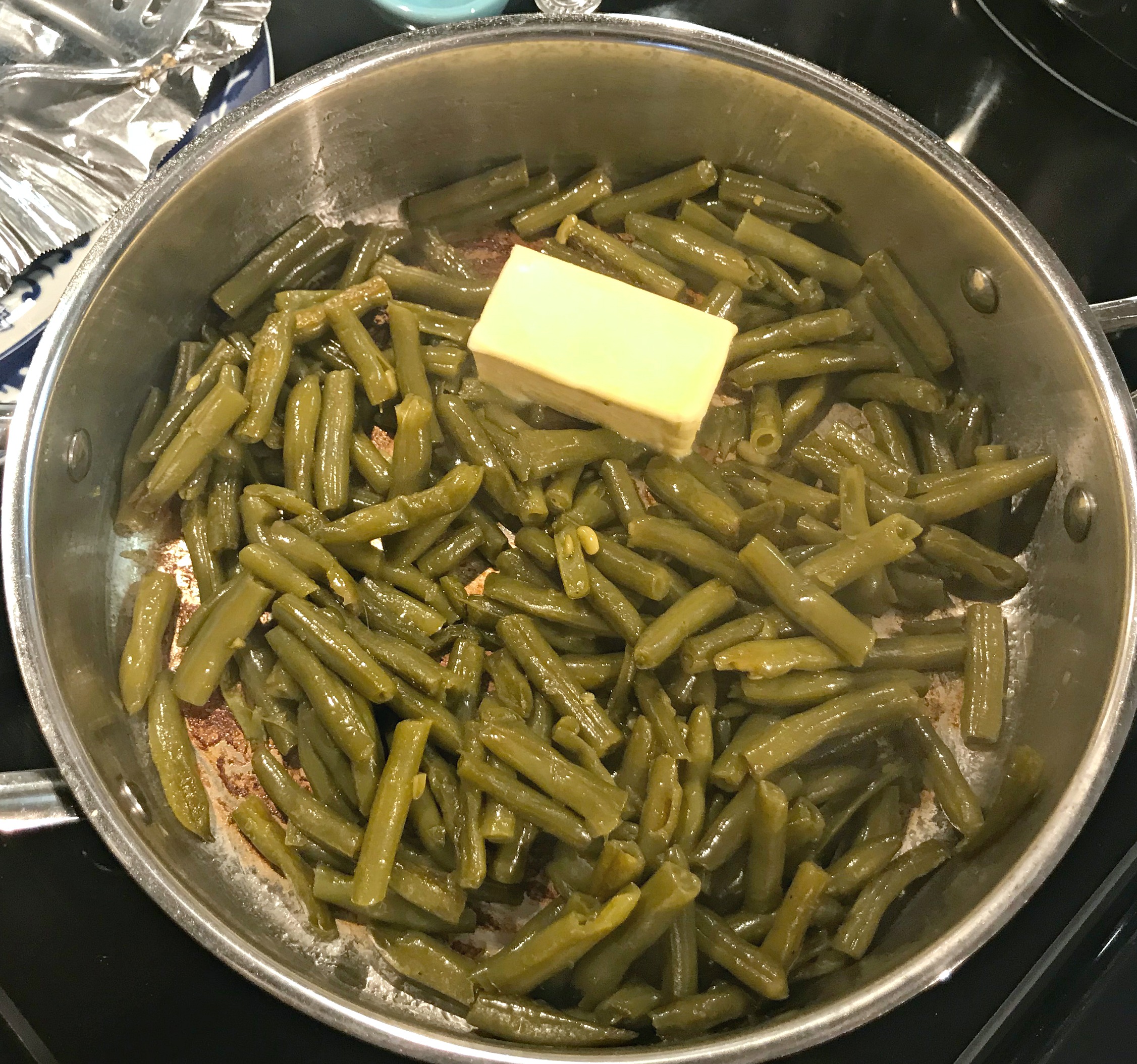 Once the liquid has almost completely cooked off, add 2 Tablespoons of Margarine for each can of green beans. When I do two cans, I just use half a stick of margarine. Reduce the heat to medium or medium low and let the beans cook down, stirring to make sure they are all coated with margarine, until they are slightly browned.