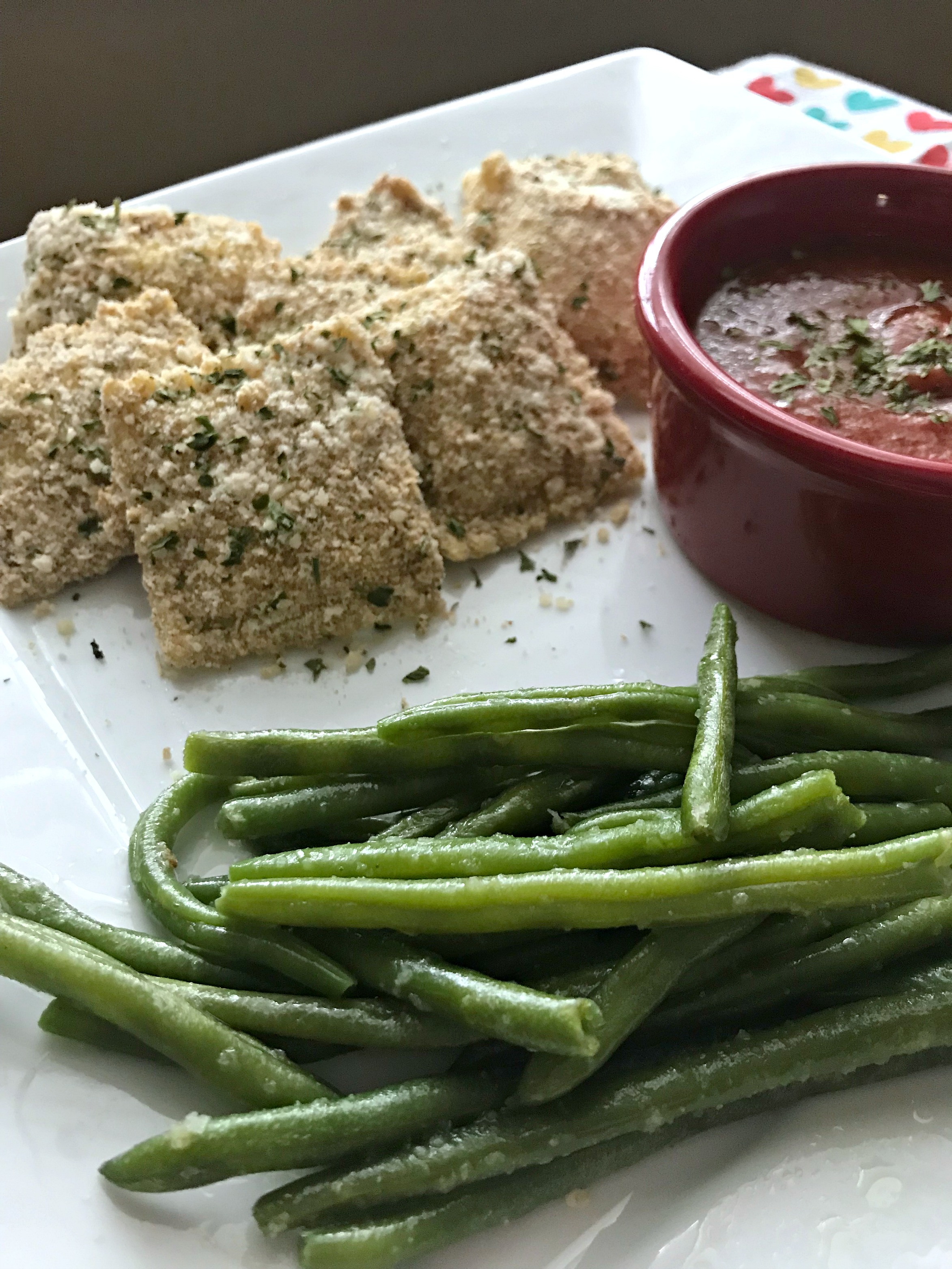 These are really good with a side of pizza or marinara sauce – I love the jars of Rinaldi pizza sauce from the Dollar Tree. I served my toasted ravioli with Garlic Green Beans, another family favorite!