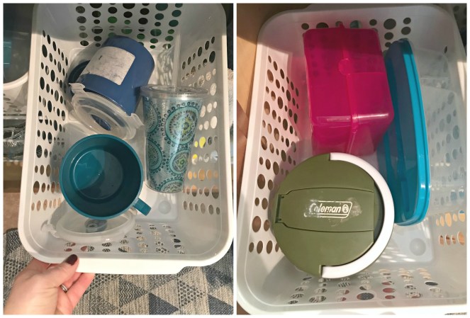 The 3-level rack was $5 at Aldi – it would also work really well as an eye-level system for plates. All the other bins came from Dollar Tree! The containers I use for taking my lunch to work are such odd sizes and shapes that they don’t fit well in drawers. These large bins are perfect!