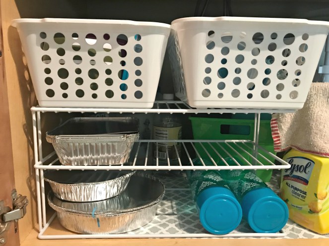I didn’t want to just shove random items in the new space – I thought about the cabinets that were too full and the items that were annoying to put away because they didn’t fit well. That helped me decide what to organize on the left side of the cabinet!