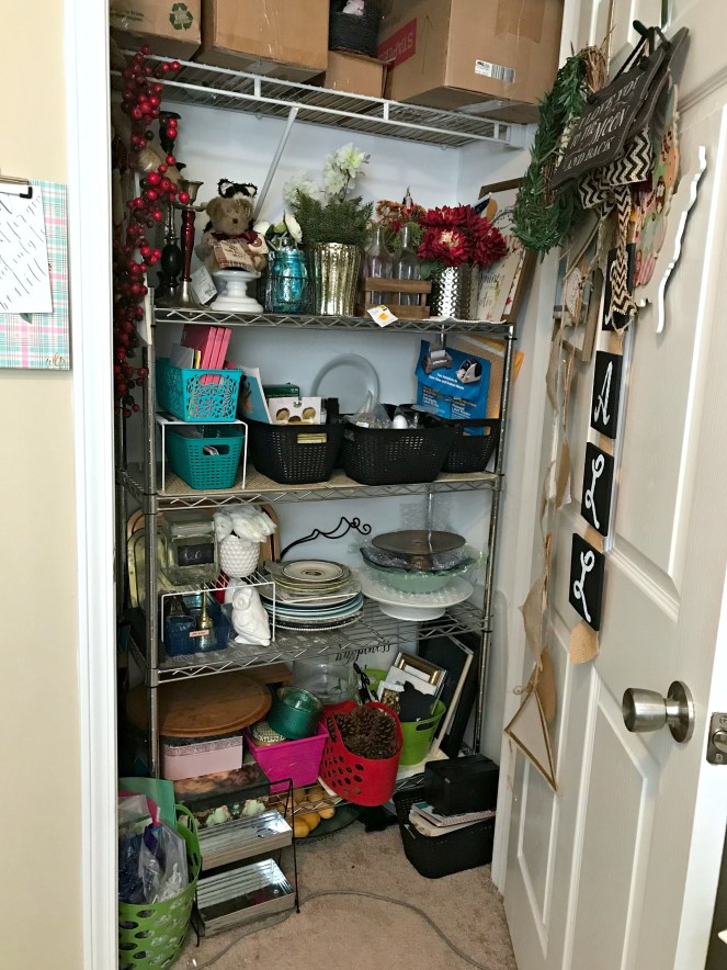 The closet in my home office houses extra non-holiday decor, crafting items and gifting supplies. My office is always the messiest room in the house because it’s a work space – but the closet had gotten really out of hand. Here’s the proof.