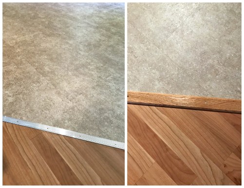 When we had our floors installed, they had to remove the matching wood trim that originally separated the kitchen floor and the wood floor that covers the living room. I was in my office for 10 minutes and came back down to see that they’d installed horrible strips of metal trim (left picture below) that I hated! We talked to the foreman who had the workers replace it with matching trim that looked so much better (right picture).