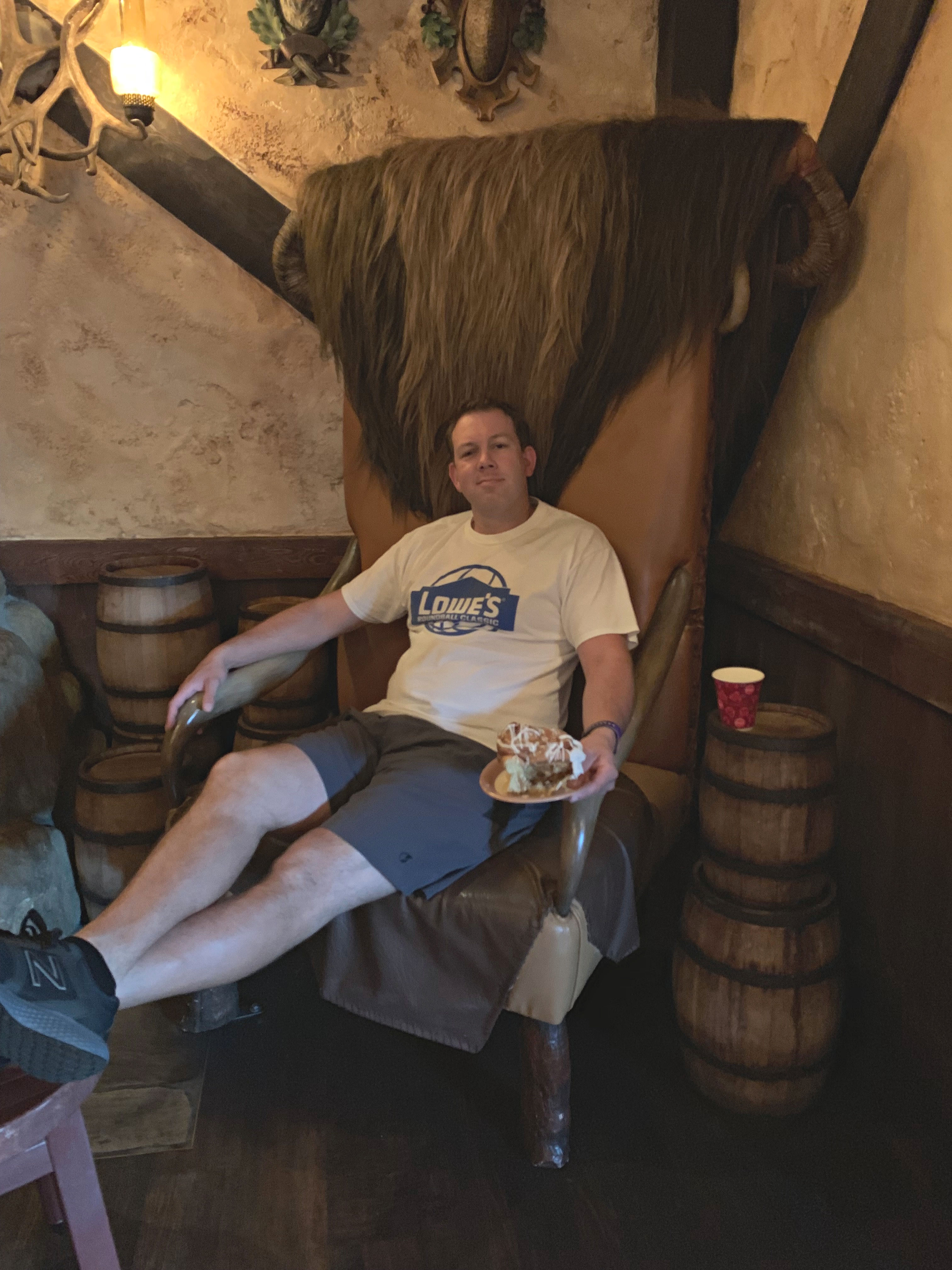 Our first stop was breakfast at Gaston’s Tavern! We shared a huge cinnamon roll (a snack credit if you’re on the dining plan) and I got a cup of coffee. Here’s Paul’s best smug Gaston impression. I came back from fixing my coffee to find him posed like this, waiting for me to take his picture! 🙂