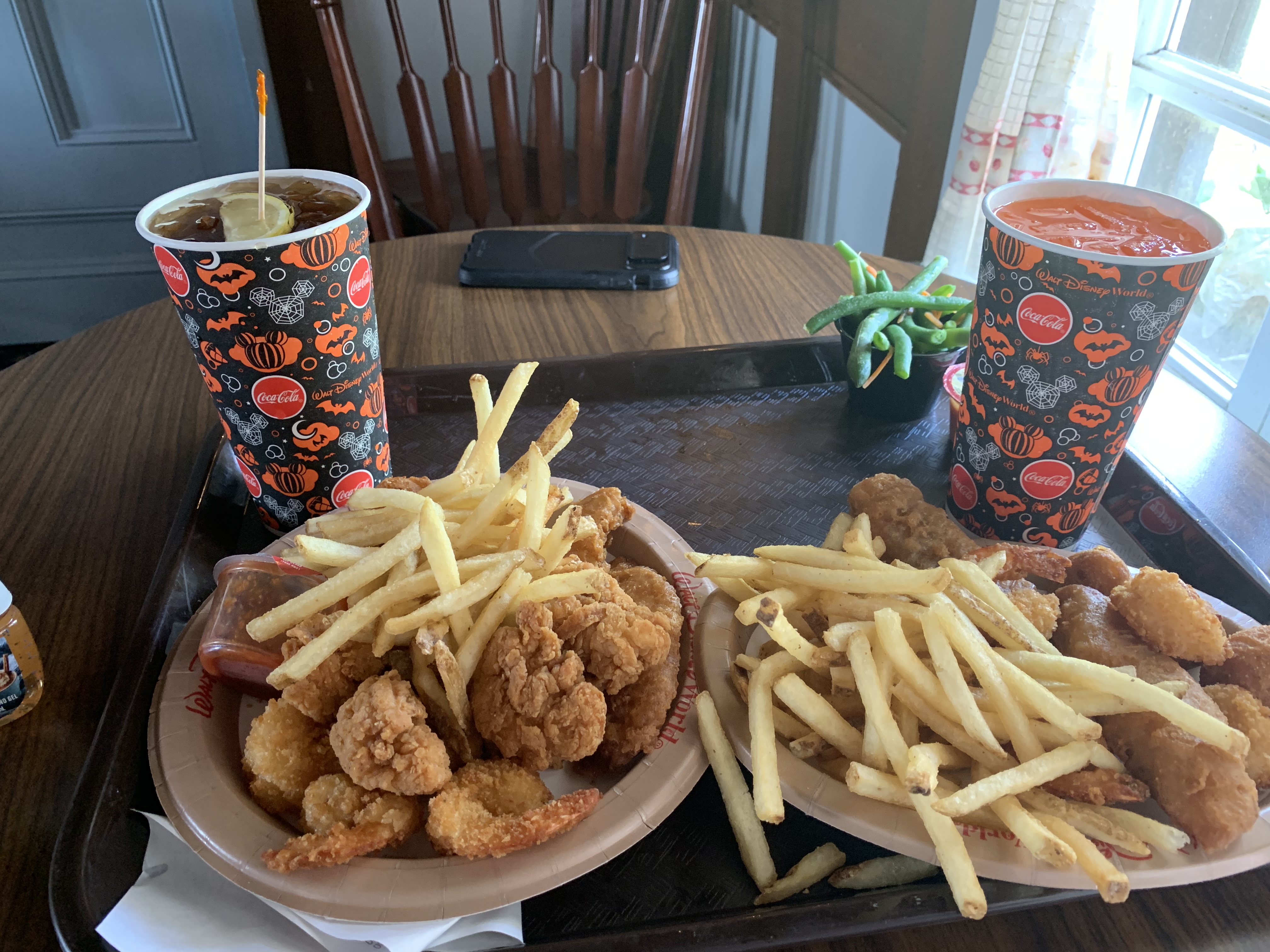 We both ordered plates with fish and chips – mine also had hush puppies and Paul’s also had chicken. We both enjoyed our food, especially the shrimp! Our table had a lovely view of Fantasyland, which I did a terrible job of capturing in this photo. Just trust me. 🙂