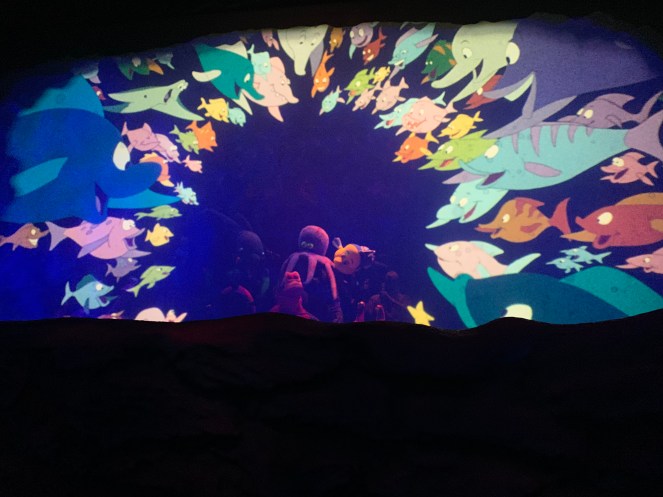 We had a fast pass for Voyage of The Little Mermaid, which was a cute show. It’s a puppet show (you can see one of the puppeteers in my photo) that even little kids would enjoy. They use a mix of video, puppets and live performers. On top of that, the chairs are really comfortable and the AC feels great!