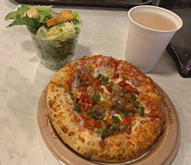 There were several restaurants I debated on trying, but we settled on Pizza Rizzo in the Muppets Courtyard. It was delicious! We both ordered personal pizzas that came with Caesar side salads. On the Quick Service plan, you can order any beverage as part of your meal. They also had a self-service stand with cups of ice water. I ordered a non-alcoholic Peach Bellini that was so good and refreshing!