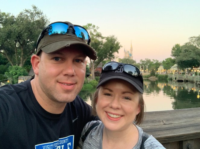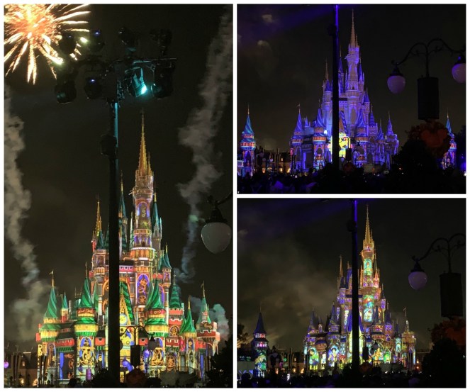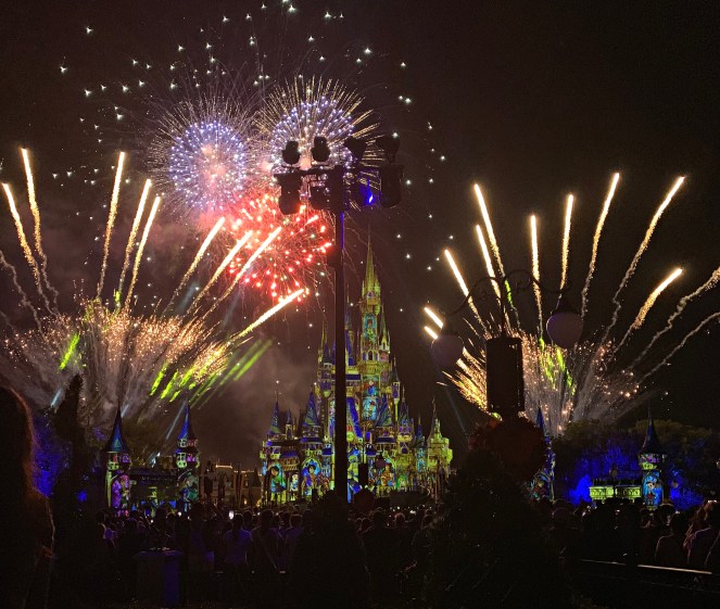 The thing about Magic Kingdom fireworks is that you have to find your spot about an hour before they begin. You just hang out there, smooshed in with loads of hot, tired, sweaty people. It’s a magical time. LOL. I recommend a handheld fan and lots of water!