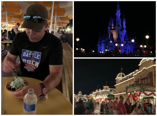 Paul ordered a mint chocolate chip brownie sundae from The Plaza Ice Cream Parlor and then we grabbed a seat right across from the castle. It was 10:30 by this time – we never, ever stay out this late and it felt like an extra special date night!