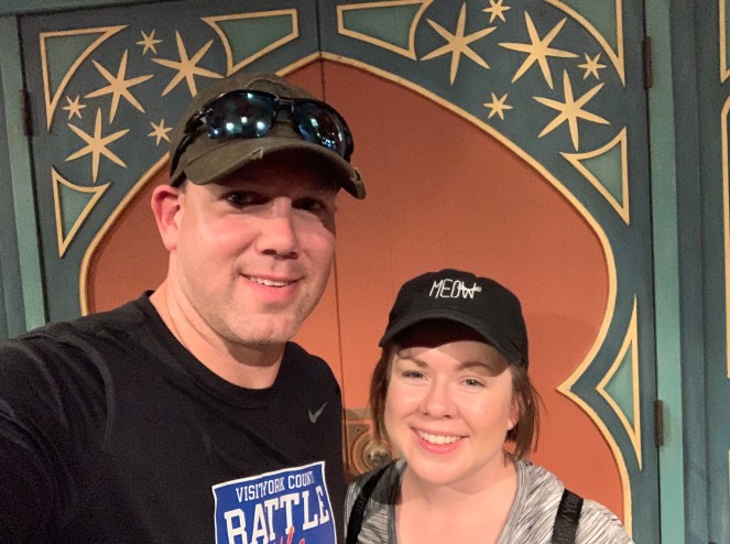 Since we had evening extra magic hours, we headed back to ride The Magic Carpets of Aladdin one more time! It was fun to ride that one in the dark! We snuck a sweaty selfie in Aladdin & Jasmine’s meeting spot. 🙂
