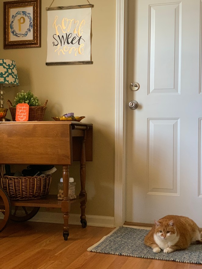 I also found this blue and white rug (machine washable!) for $8. It was the last one they had and was stuffed randomly on a shelf. It is exactly what I wanted for this spot, and the cats love it too. 🙂