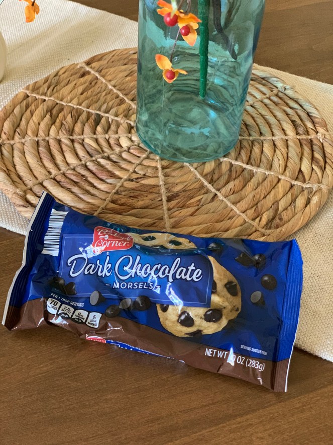 They always bring out a few new things to the baking aisle this time of year, and I picked up these dark chocolate chips. We always end up snacking on chocolate chips (anyone else?), but if they last long enough I’ll try them in some cookies. 🙂 These are not as good as name brand chips – but they are much, much cheaper.