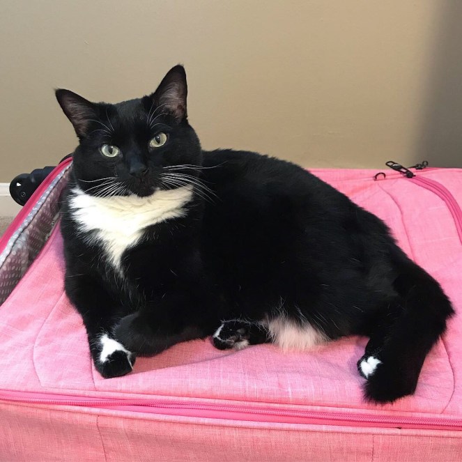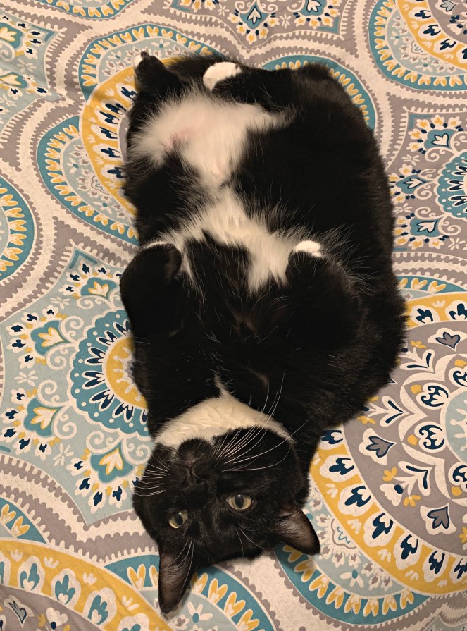 They both follow me around the house, and since we’re all creatures of routine it works out well. Thelma Lou watches me get ready from her spot on the bed every morning and usually ends up in some upside down pose like this one. She is such a funny cat!
