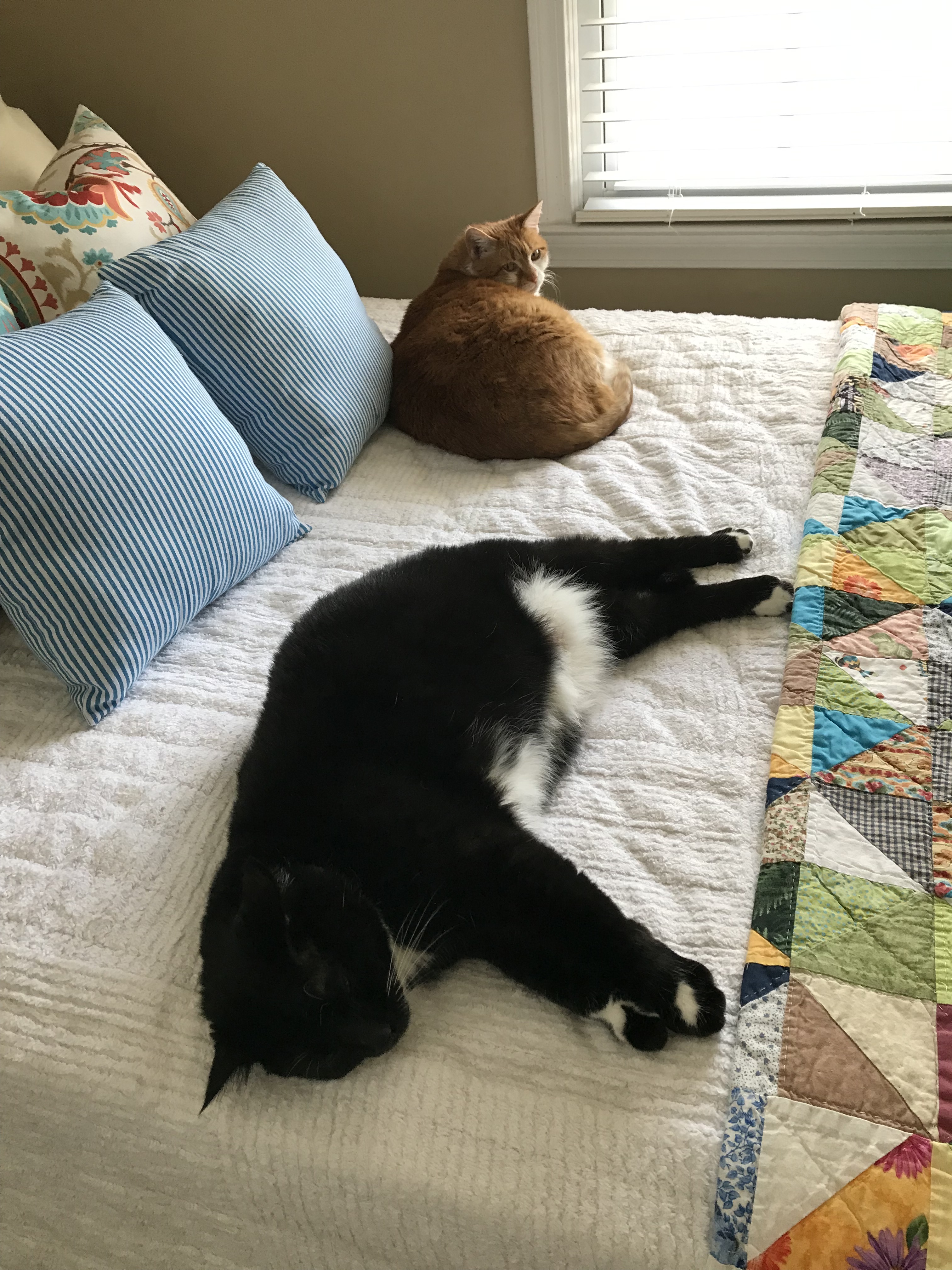 They spend their days sleeping in various spots around the house and rarely share a spot like this anymore, so I was surprised to find them on the guest room bed at the same time!