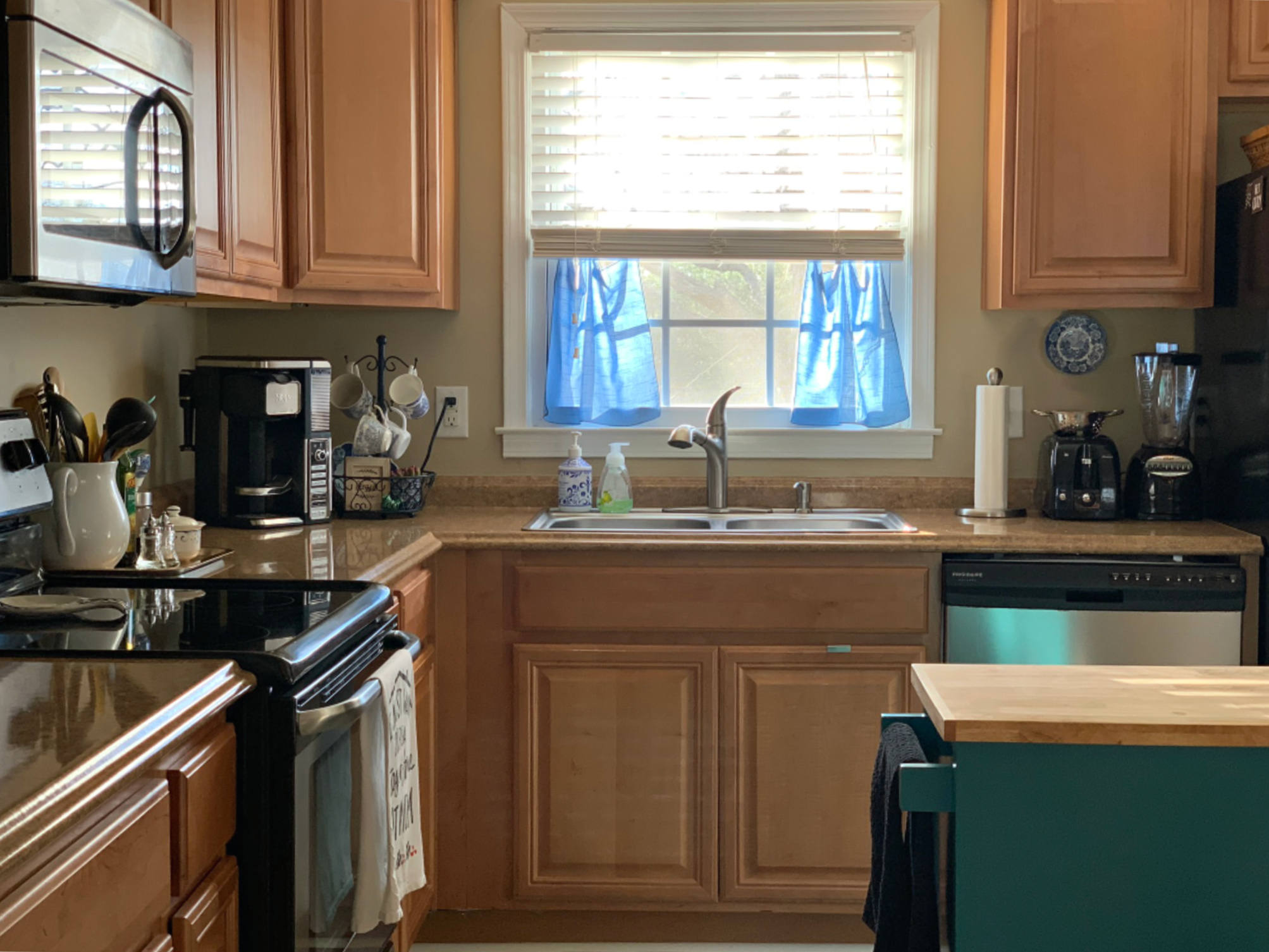 My kitchen isn’t the fanciest or the most Instagrammable one out there – I have builder grade cabinets with no hardware, clunky blinds (that I can’t live without – how do people live without blinds?!) and yellow undertones instead of trendy gray or white. And yet I love my kitchen! 🙂