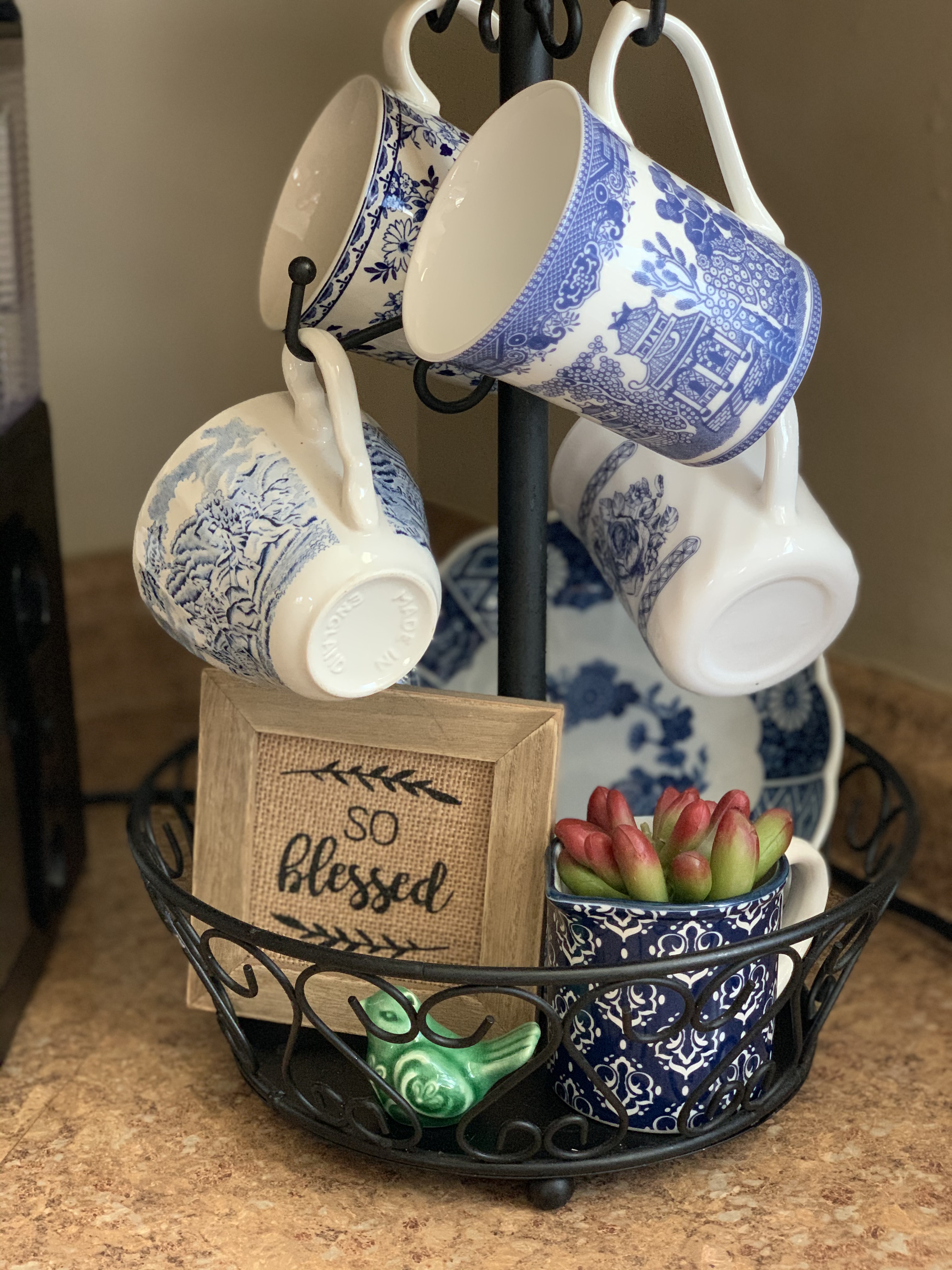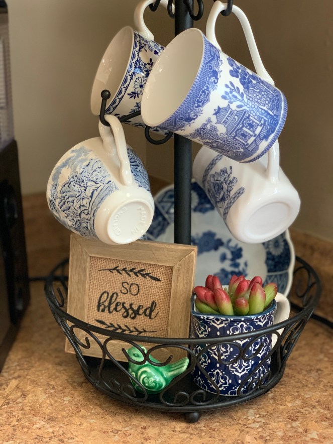 My coffee mug display contains more blue and white treasures from my Gramma’s collection, cups I’ve received as gifts, a thrifted cup and one from our recent trip to Disney!