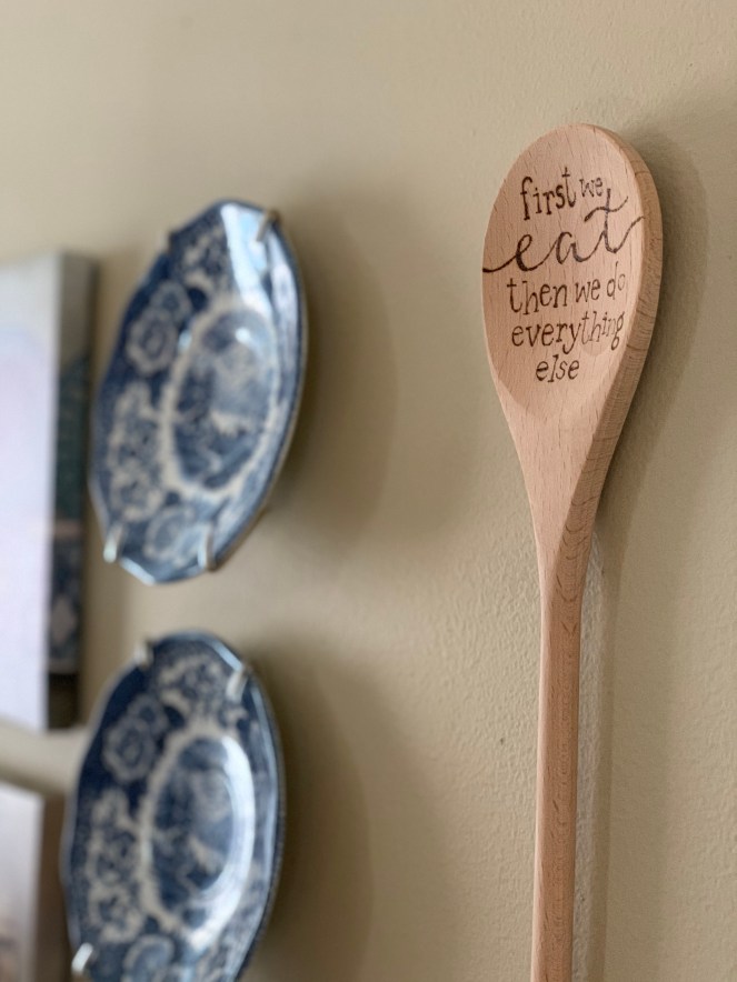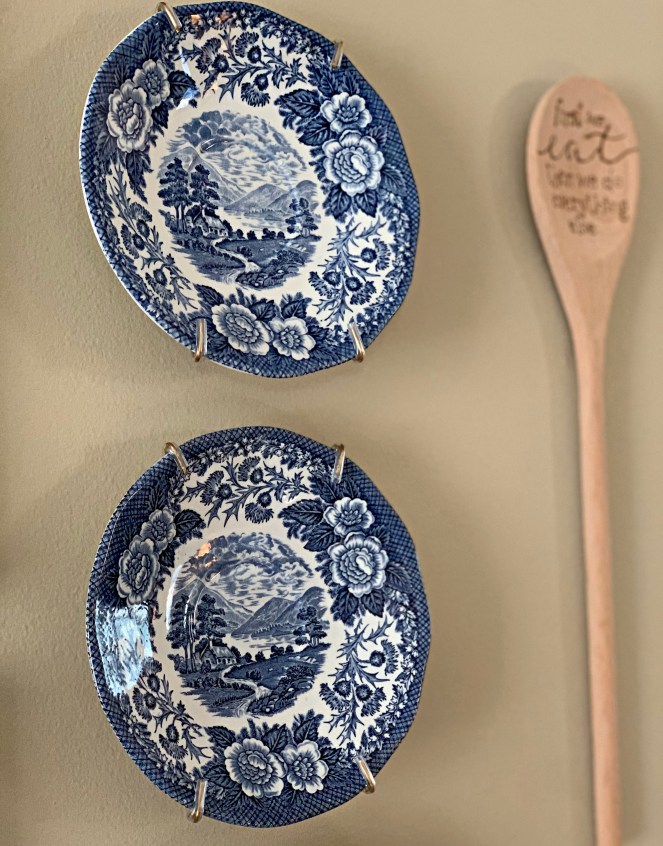 This little gallery on my wall is the most recent update! My MIL gave me those lovely saucers for Christmas and I instantly knew they would be perfect here. I hung them along with two Dollar Tree canvases I had in my stash and a custom spoon from Southern Bliss Designs.