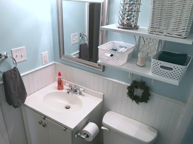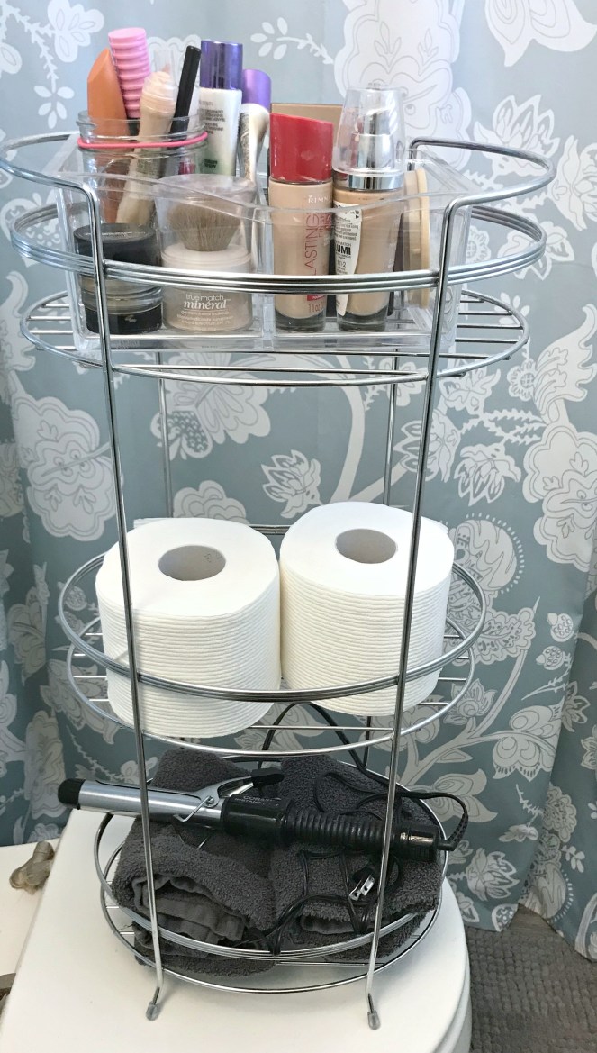 Most of the bins and containers I use to organize my home come from Dollar Tree, but when I need a specific or larger organizational system I run right to these stores. The bathroom tower above came from TJ Maxx and was less than $20, and I found the matching white bins for our bathroom shelves on clearance for $2 each!