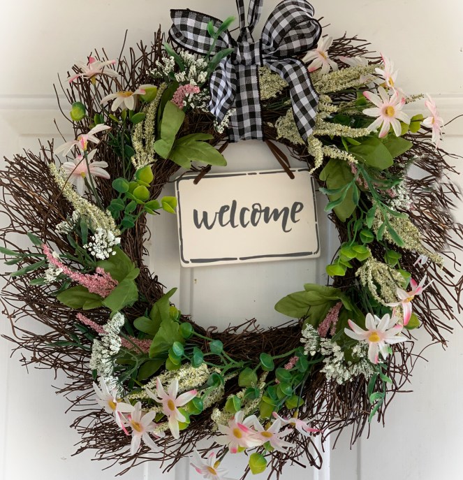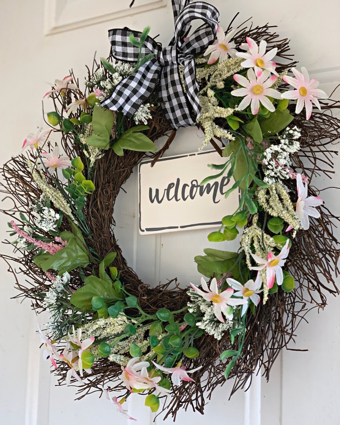 Last week on Instagram I saw a floral wreath with black and white checked ribbon – and I knew that was the look I wanted. Hobby Lobby is my go-to store for ribbon, and I found exactly what I needed (it’s 50% off this week, too!)