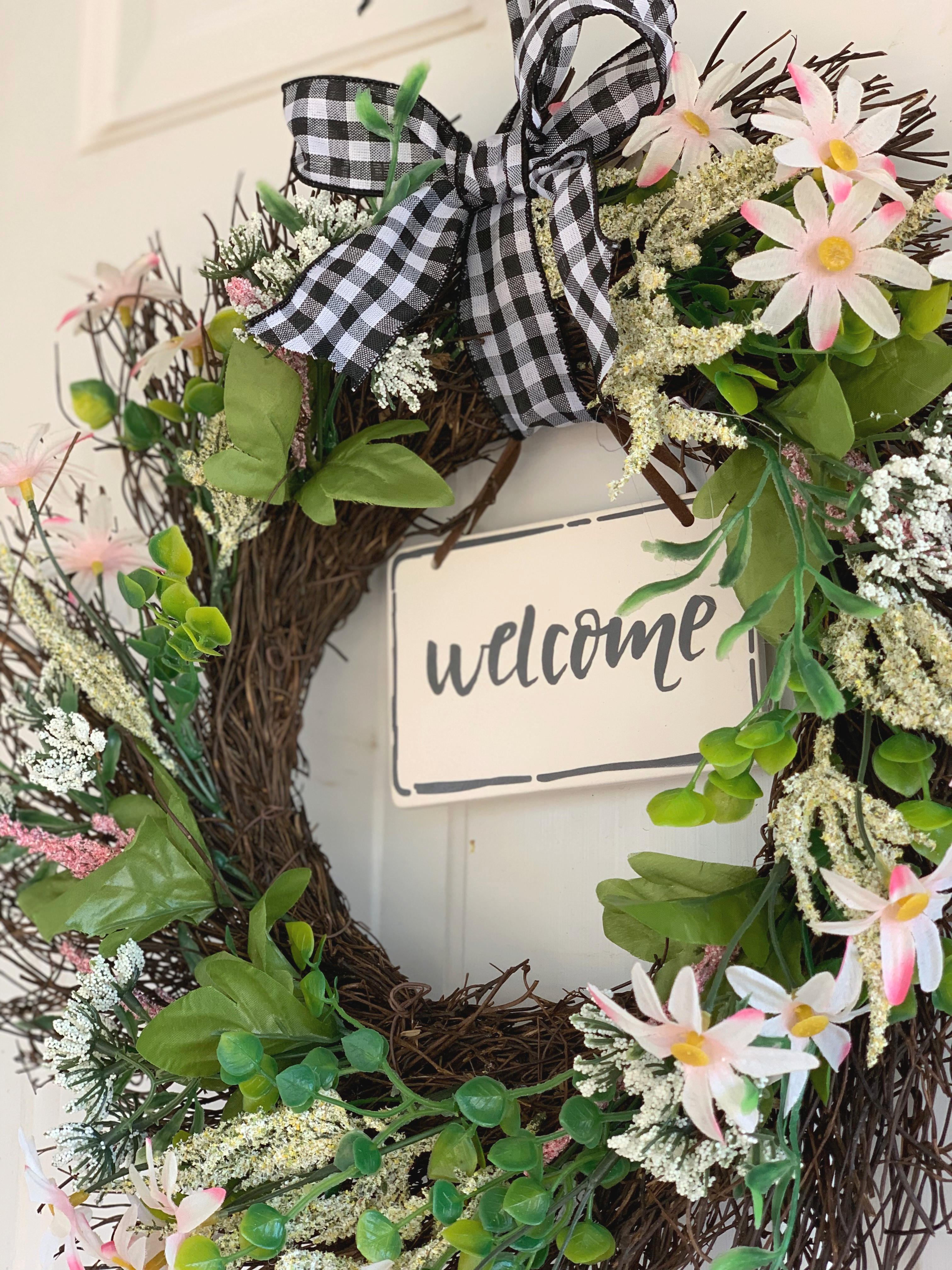 Last week on Instagram I saw a floral wreath with black and white checked ribbon – and I knew that was the look I wanted. Hobby Lobby is my go-to store for ribbon, and I found exactly what I needed (it’s 50% off this week, too!)