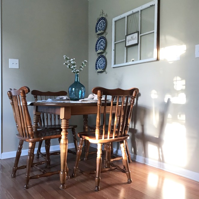 One of the “staples” in my home decor is the plate rack that hangs on the wall in the dining area. I bought it at Hobby Lobby years ago, and I have so much fun decorating it with my favorite plates!
