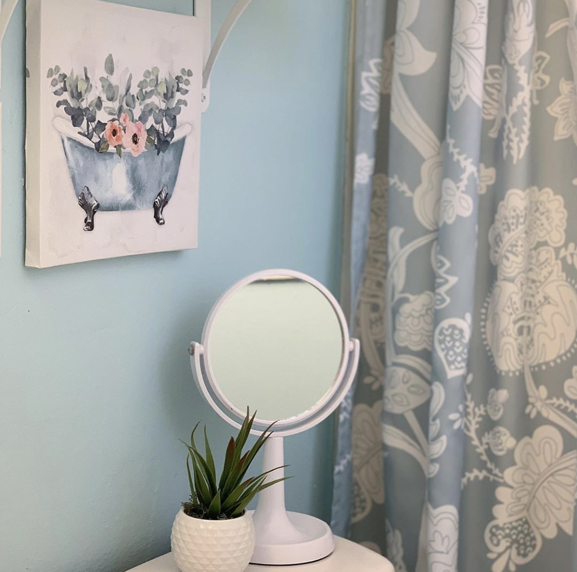 If you can’t think of anything you love about your bathroom, look for a way to fix it (without spending any money). Clean off the counters, add a vase of flowers or open the curtains. It doesn’t have to transform the whole room. Just find something small – you might be surprised at the big impact!