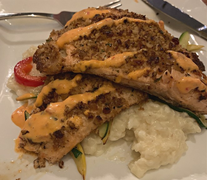 #3 We enjoyed a slightly splurgy date night last weekend at one of our favorite local restaurants, Great Bay Oyster House. I ordered the Pecan Crusted Catfish with Red Pepper Aioli over Parmesan Risotto and it was absolutely delicious! Paul had a burger and onion rings. 🙂 We’re definitely opposites in the food category!