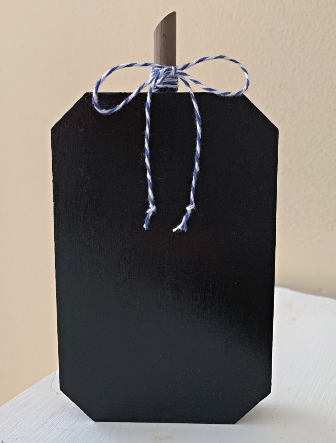 Some of those Dollar Tree wooden pumpkins have glitter lettering. I painted over an extra orange one I had from last year, so I started by removing the words with sand paper. It didn’t take very long at all! I taped off the stem and gave the pumpkin two coats of a deep navy acrylic paint from Dollar Tree.