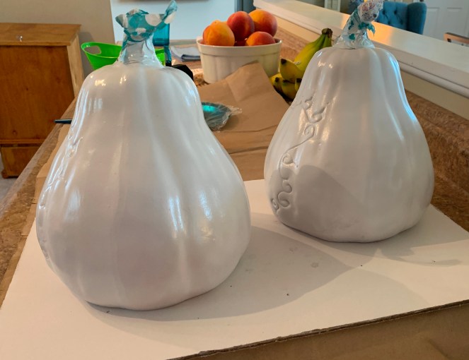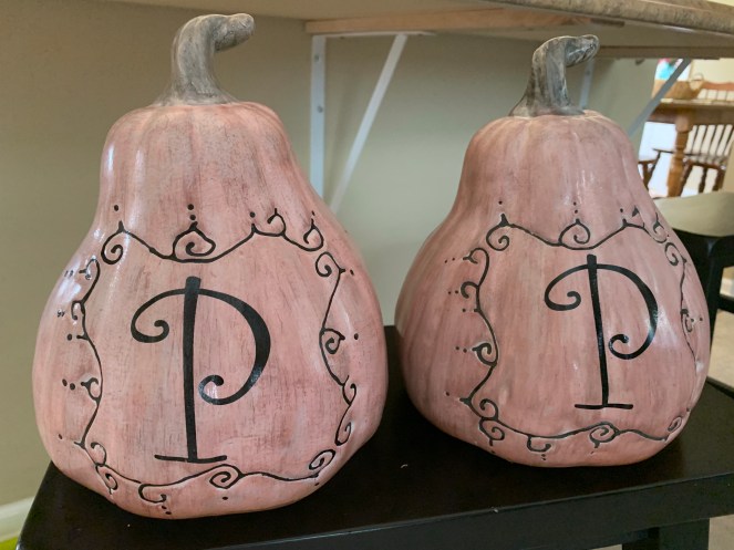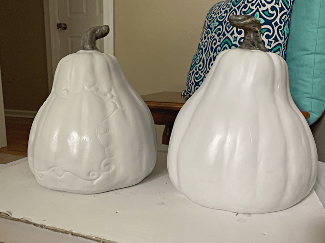 This year I decided to give a couple pumpkins what I like to call “The Fairy Godmother Treatment!” I started with these outdoor pumpkins that were horribly faded.