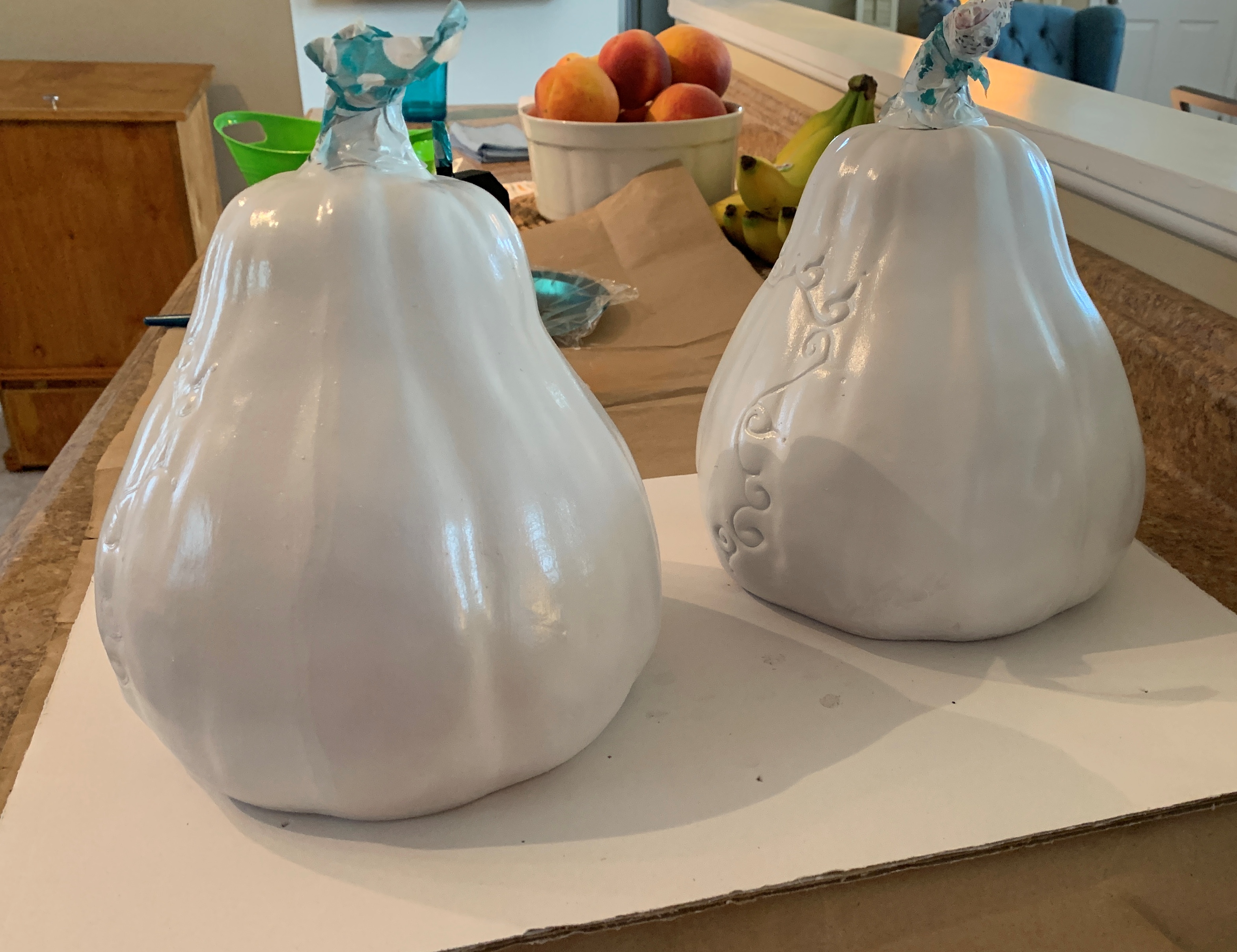 This year I decided to give a couple pumpkins what I like to call “The Fairy Godmother Treatment!” I started with these outdoor pumpkins that were horribly faded.