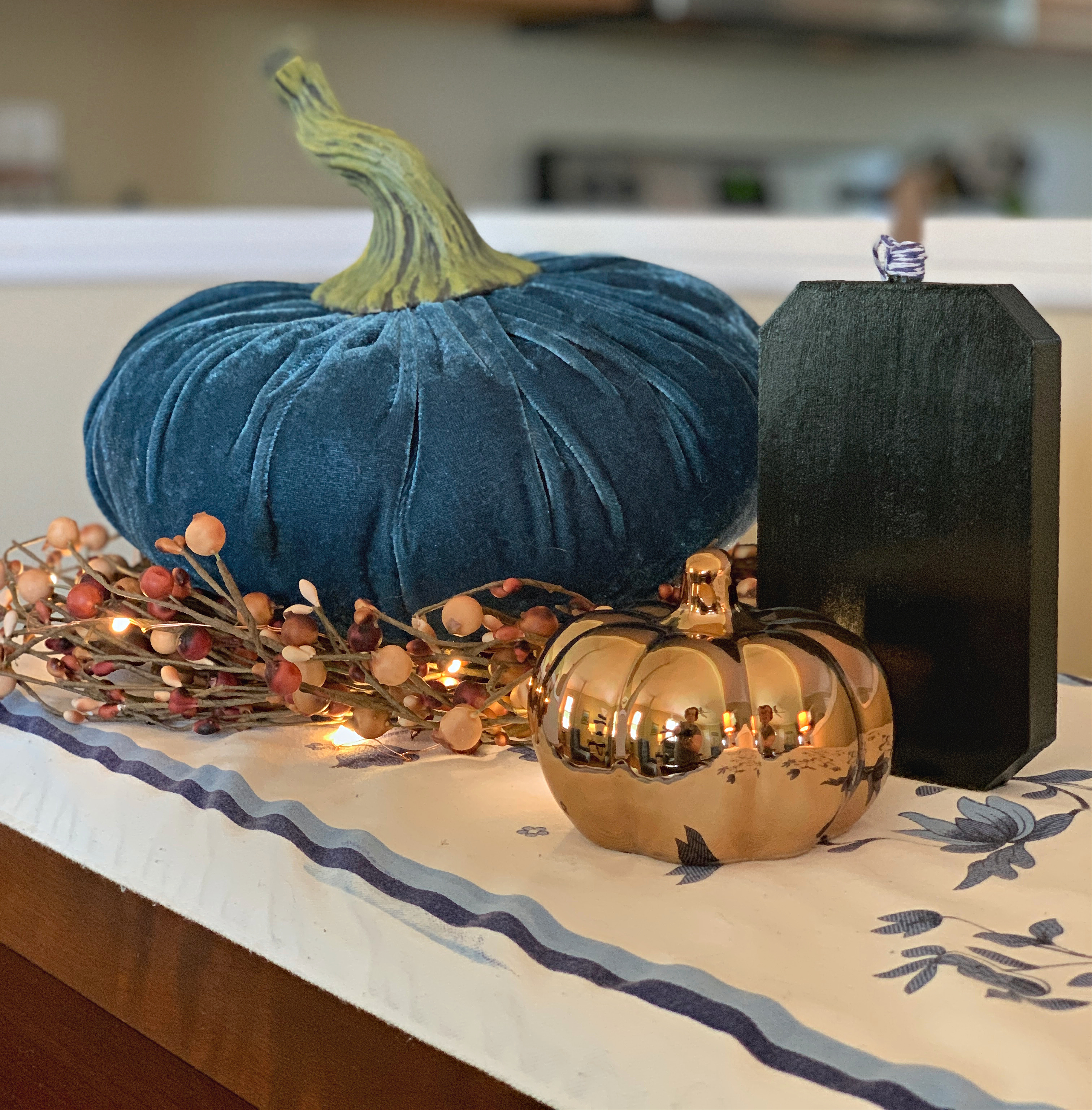 Find details for the DIY Blue Wood Pumpkin (below) on this post!