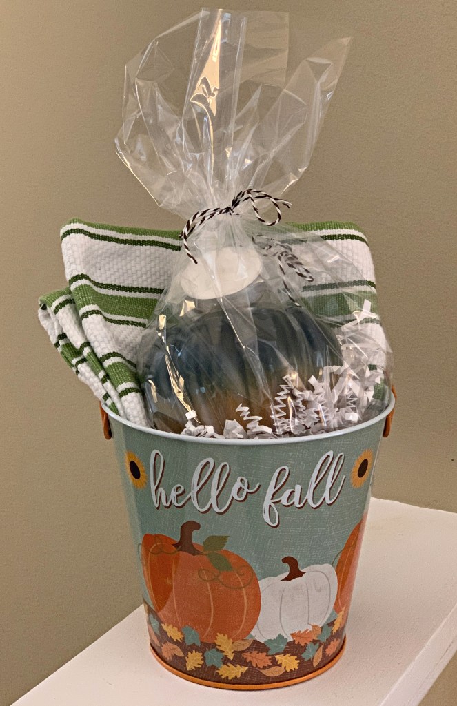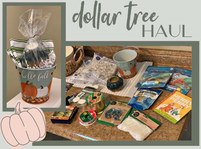 I haven’t needed very many hostess gifts this year, so I really enjoyed putting this one together last week! The more neutral sage greens and blues that Dollar Tree has in their fall collection are so pretty and blend in nicely with lots of decor colors.
