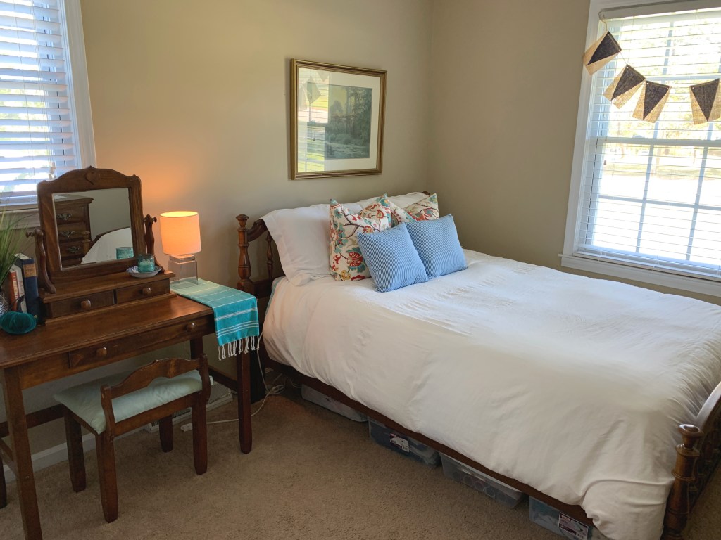 I added a quilt under the duvet and made the bed with a set of sheets that are available on Amazon. The bed always has clean sheets on it so that I’m always ready for company!