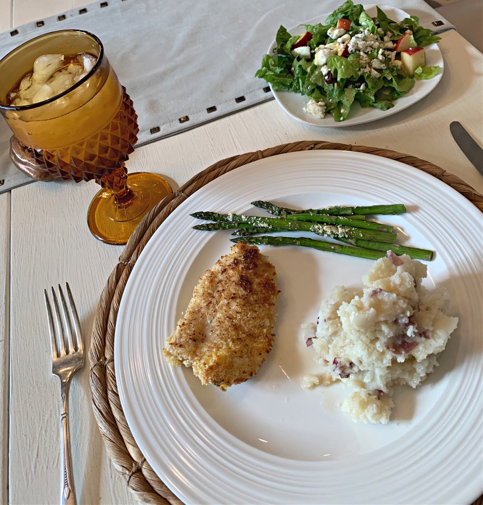 I ended the day with supper at my parent’s house. My mom made her Chicken Piccata, Red Skin Mashed Potatoes with Lemony Gravy, Asparagus and one of her famous salads, and I got to try her new Apple Cake for dessert.