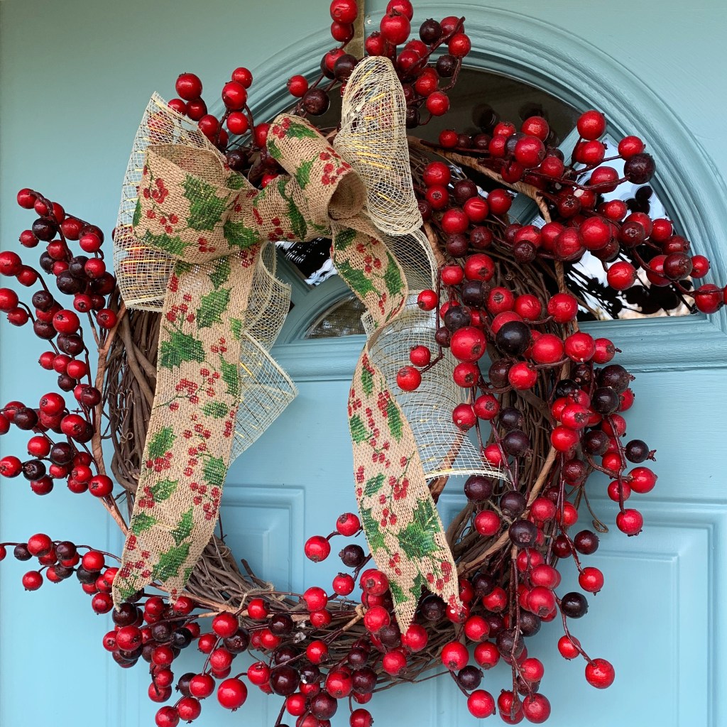 When we painted our front door this spring, I specifically chose a color that would work well with Christmas wreaths. I love how the red berries pop against my blue door!