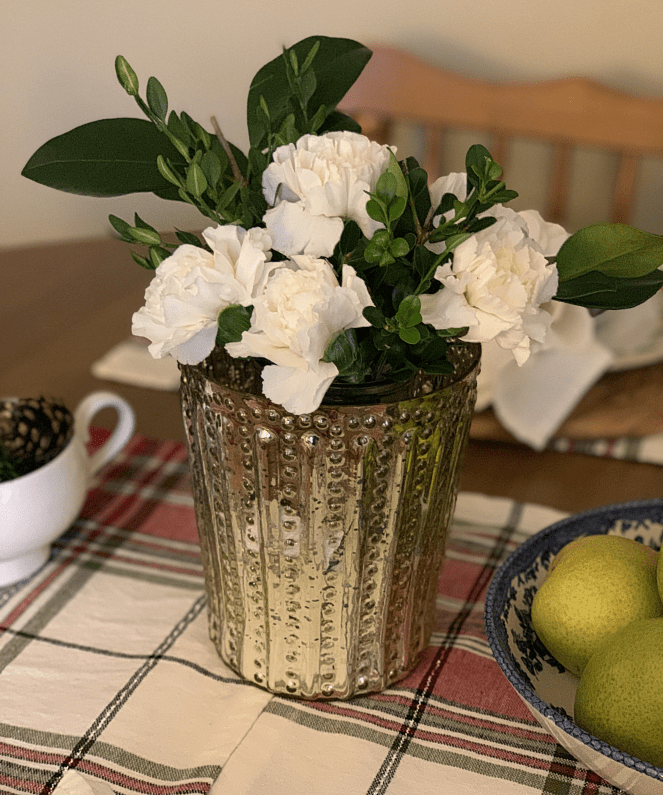 For the dining room table, I combined a $4 bunch of grocery store carnations with free greenery from my yard!