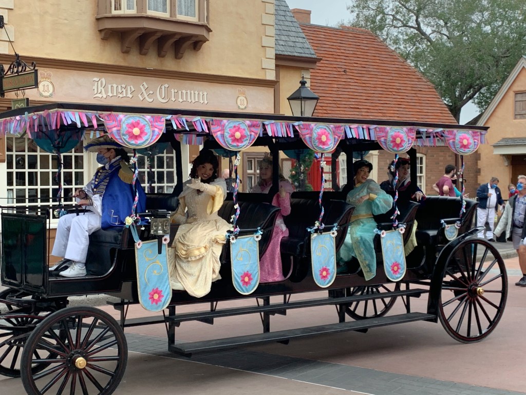 I absolutely LOVE the UK pavilion in the World Showcase. One of our favorite restaurants in all of Disney World is here, the Rose and Crown. While we were eating lunch outside, a princess cavalcade (Disney’s word for mini parade) came through!