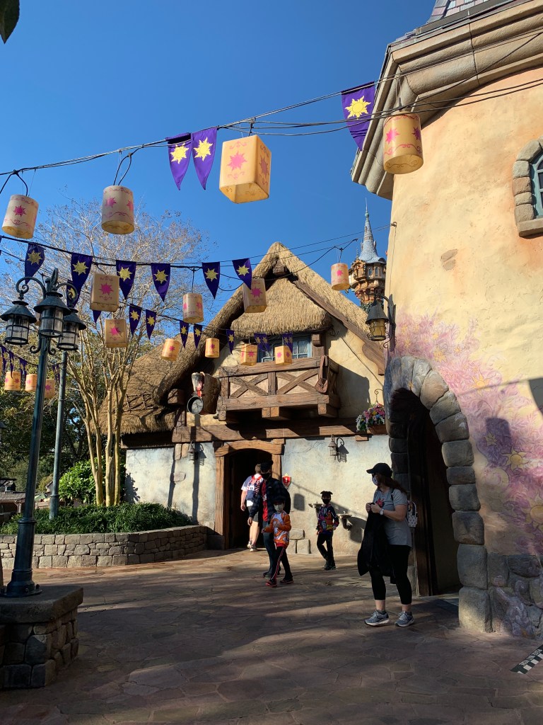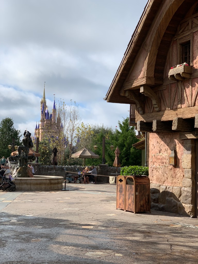 I love the cinnamon rolls and the atmosphere at Gaston’s Tavern, and the view of the castle is pretty great too! Currently Disney requires everyone to wear a mask at all times “except when actively eating or drinking while stationary.” I took our picture while we were eating our cinnamon roll. 🙂