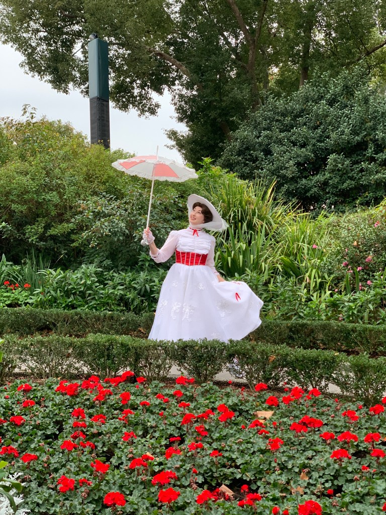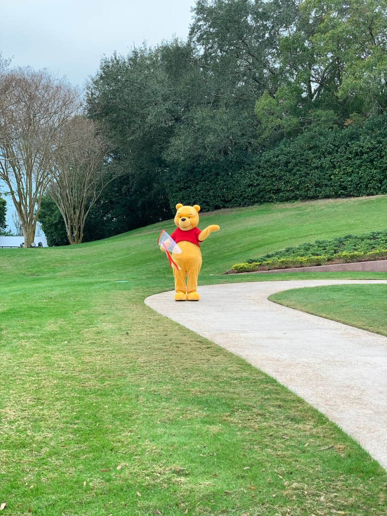 We saw so many characters in this park! Winnie the Pooh was chasing butterflies on the lawn. You can’t walk right up to characters right now or get pictures with them, but you can interact from a distance.