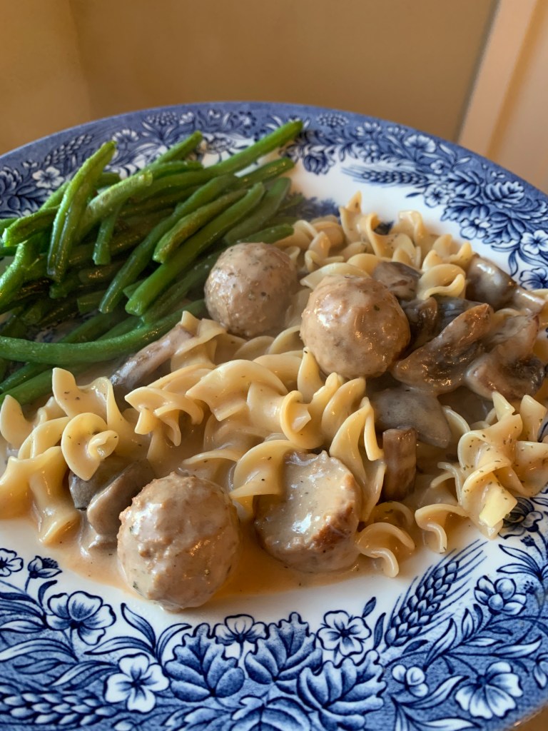 - Turkey Meatball Stroganoff (I did this on the stove top and used frozen meatballs)/Egg Noodles/Garlic Green Beans