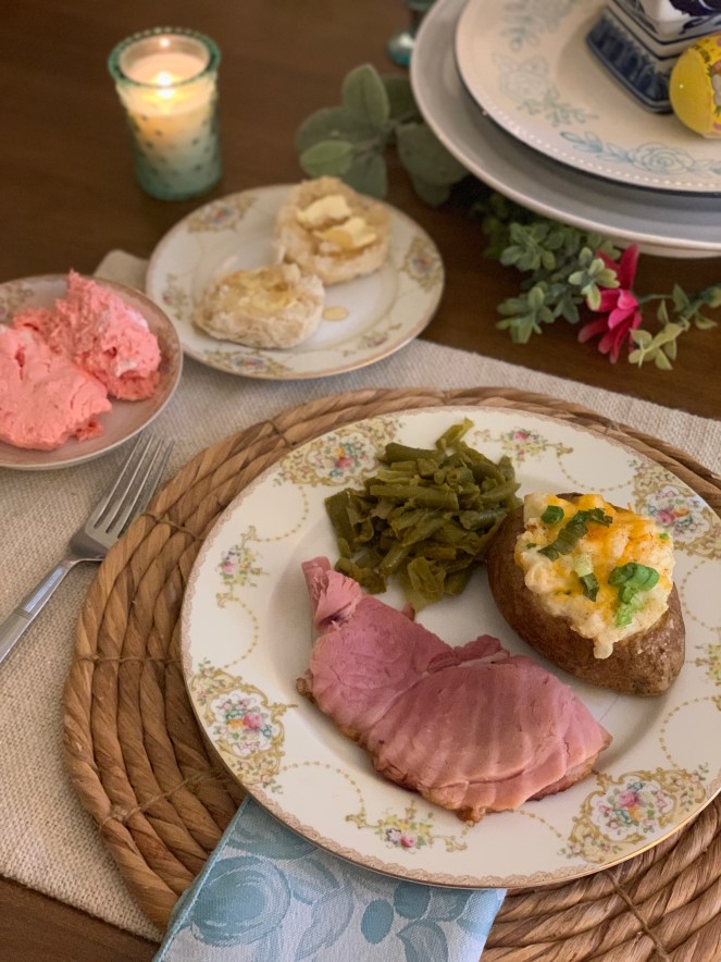 I’m with you – even if we aren’t home for the actual holiday, I put a holiday meal on my menu for the week. I just love cooking our favorites. Your grandma’s dishes are so so pretty! They’re perfect for Easter!